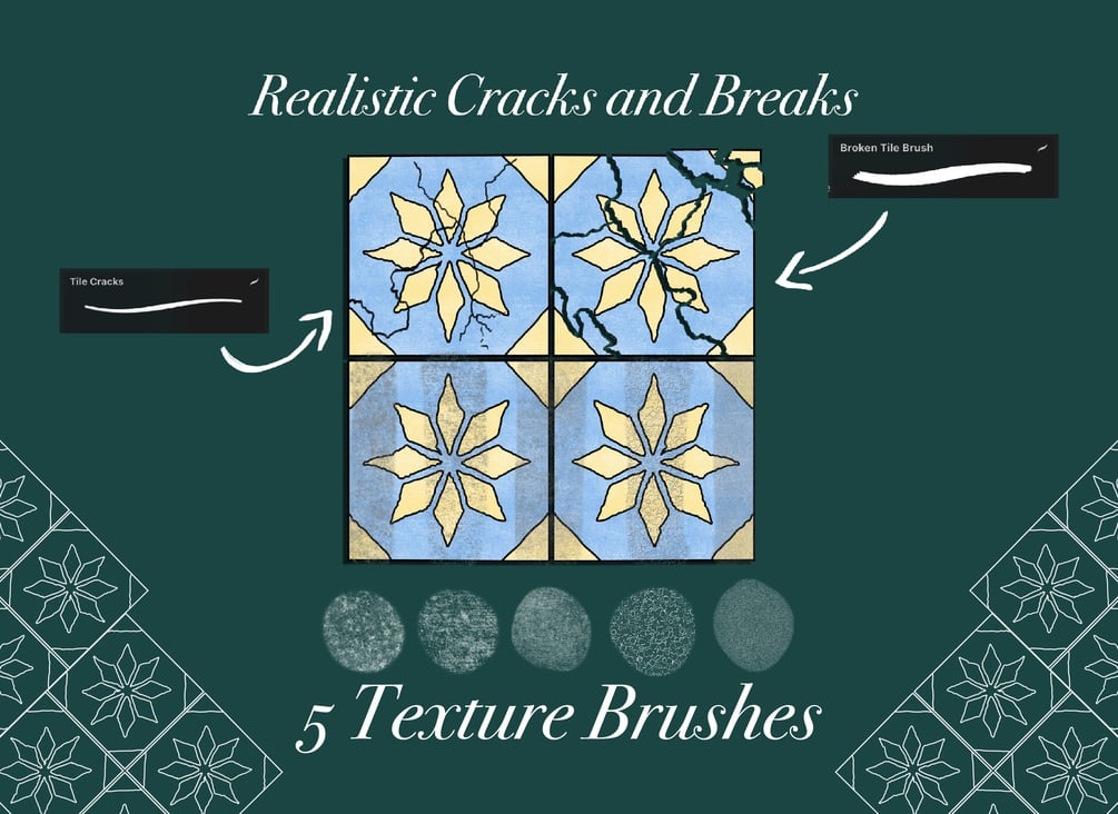 - -Layer and mix any of the 5 included texture brushes to create realistic surfaces for your tiles.